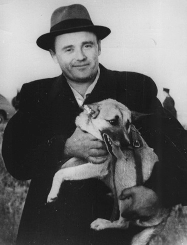 Главный конструктор С. П. Королёв с подопытной собакой на полигоне Капустин Яр, 1951 год. РГАНТД. Ф.211, оп.7, д.545