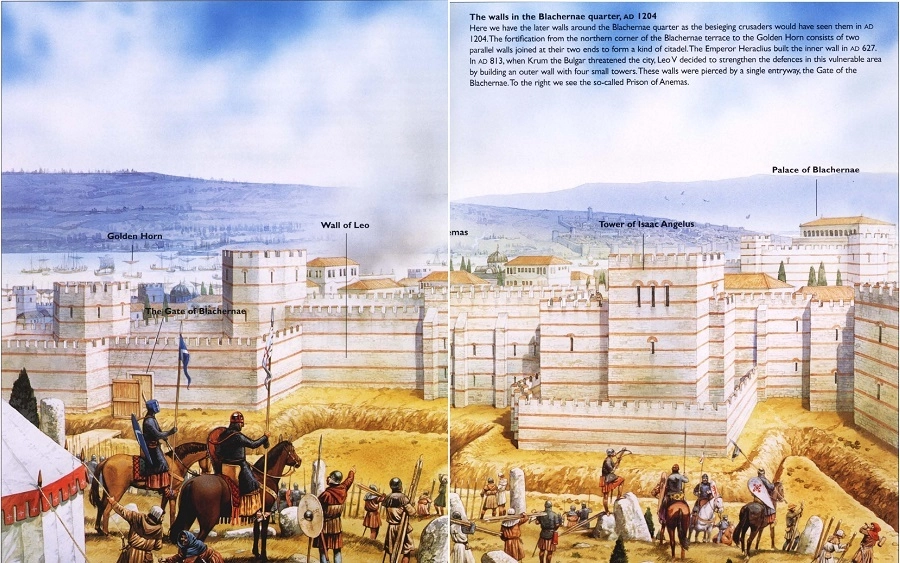 Топографическое положение и фортификационные сооружения были таковы, что город, казалось, мог выдержать любую осаду. История подтверждала эти впечатления: великая аваро-персидская осада 626 г., две грандиозные осады арабов, попытки болгар, русских и печенегов кончились крахом. Архитектура Константинополя вызывала не меньшее восхищение: Святая София, Буколеон, Влахернский дворец. Только глубокий старик (80-ти (?), 90-та (?) лет), слепой дож Венецианской республики Энрико Дандоло не мог наслаждаться вышеописанной красотой, но он лучше всех знал что делать.