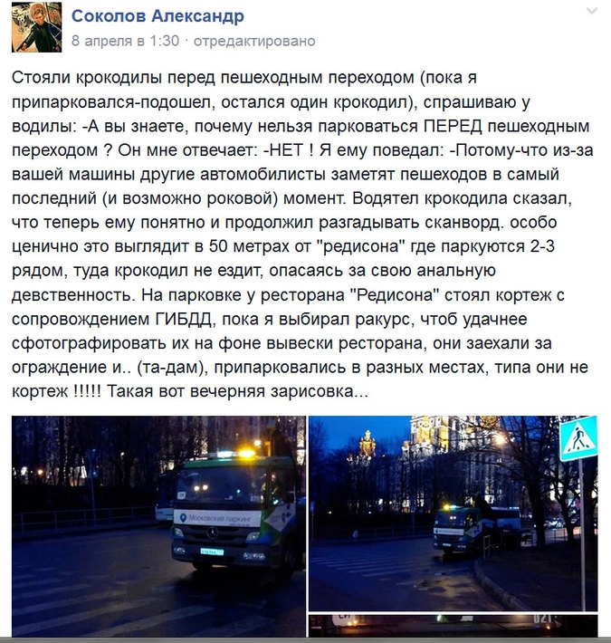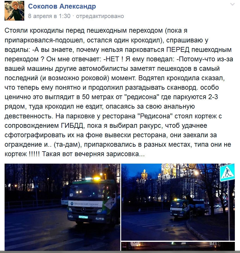 Автолюбители негодуют: московские эвакуаторы, призванные блюсти чистоту исполнения ПДД, сами нередко оказываются грубыми нарушителями. Более того, услуги эвакуации, по словам автомобилистов, превышают все мыслимые нормы. Наибольшее количество сообщений о «крокодилах» Департамента транспорта можно найти в фейсбук-сообществе «Синие ведерки».