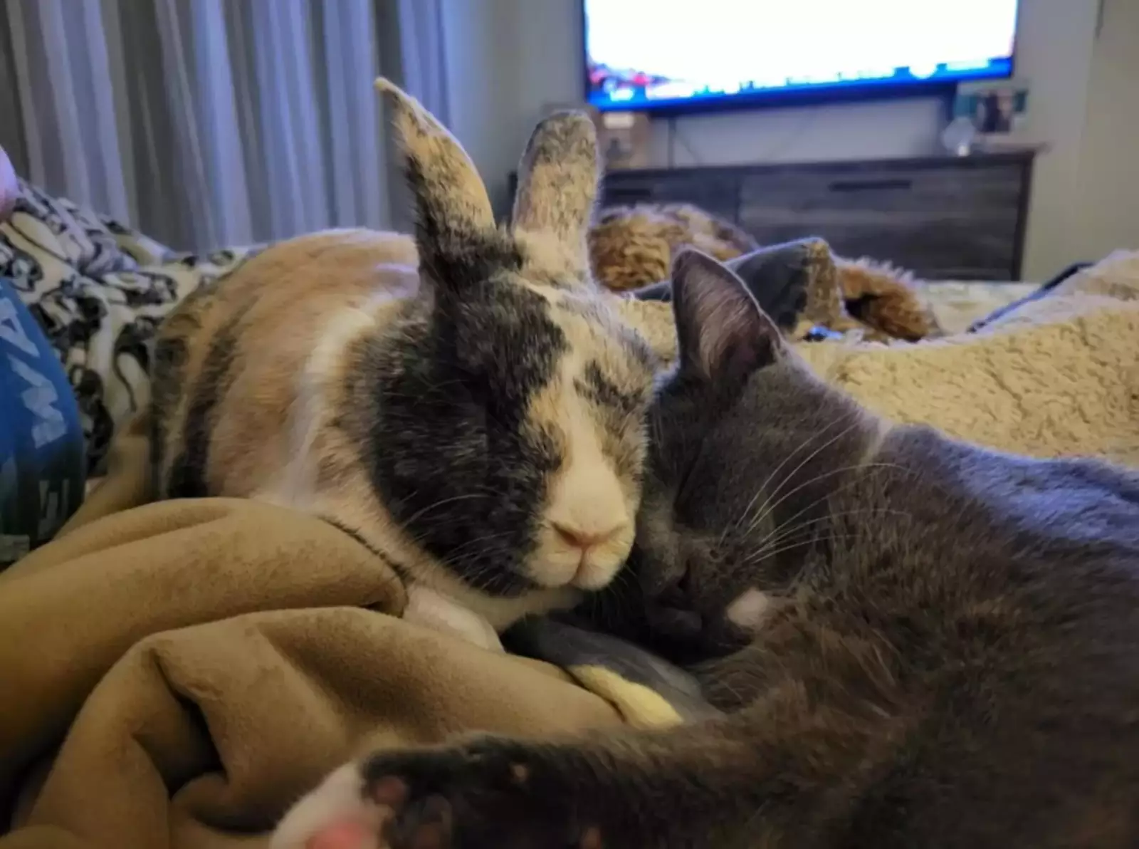 Кролик взял под крыло спасенную с улицы кошку, став ее лучшим другом