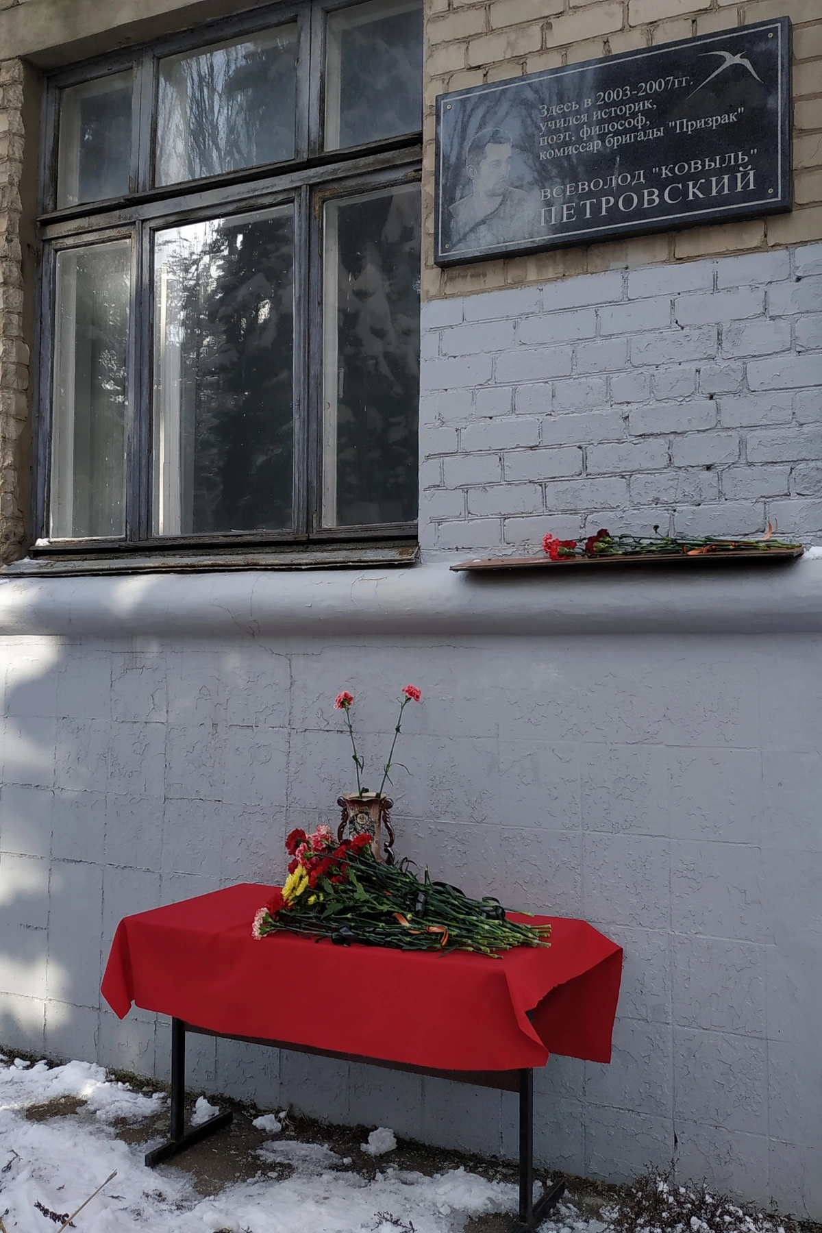 В руках у них были цветы. Люди постарше — преподаватели, несколько нардепов ДНР и средних лет интеллигентная семейная пара стояли в центре, там, где любой прохожий может видеть небольшую мемориальную доску Всеволоду Петровскому, позывной «Ковыль», выпускнику истфака, журналисту и поэту.