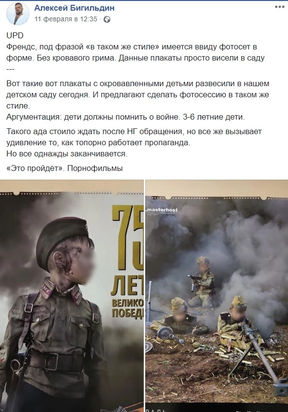 — Это тупая пропаганда, которая заходит все дальше и дальше. Не просто пошлость — уже безумие! Ладно, можно с каким-то минимальным пониманием отнестись к детям в военной форме на 9 мая. Но настолько реально визуализированные сцены войны в исполнении детей, в таком вот реалистичном гриме, могут понравиться только человеку с извращенным восприятием реальности. Лично я не понимаю, почему патриотизм обязательно должен ассоциироваться с войной, агрессией — и зачем надо фотографировать именно детей?
