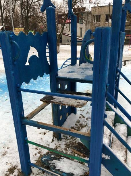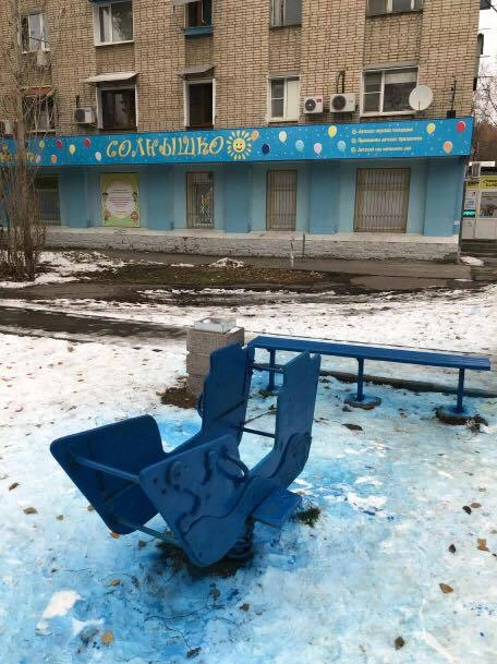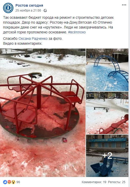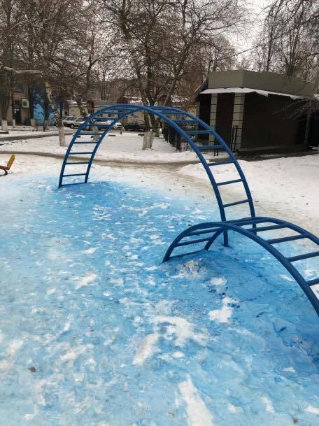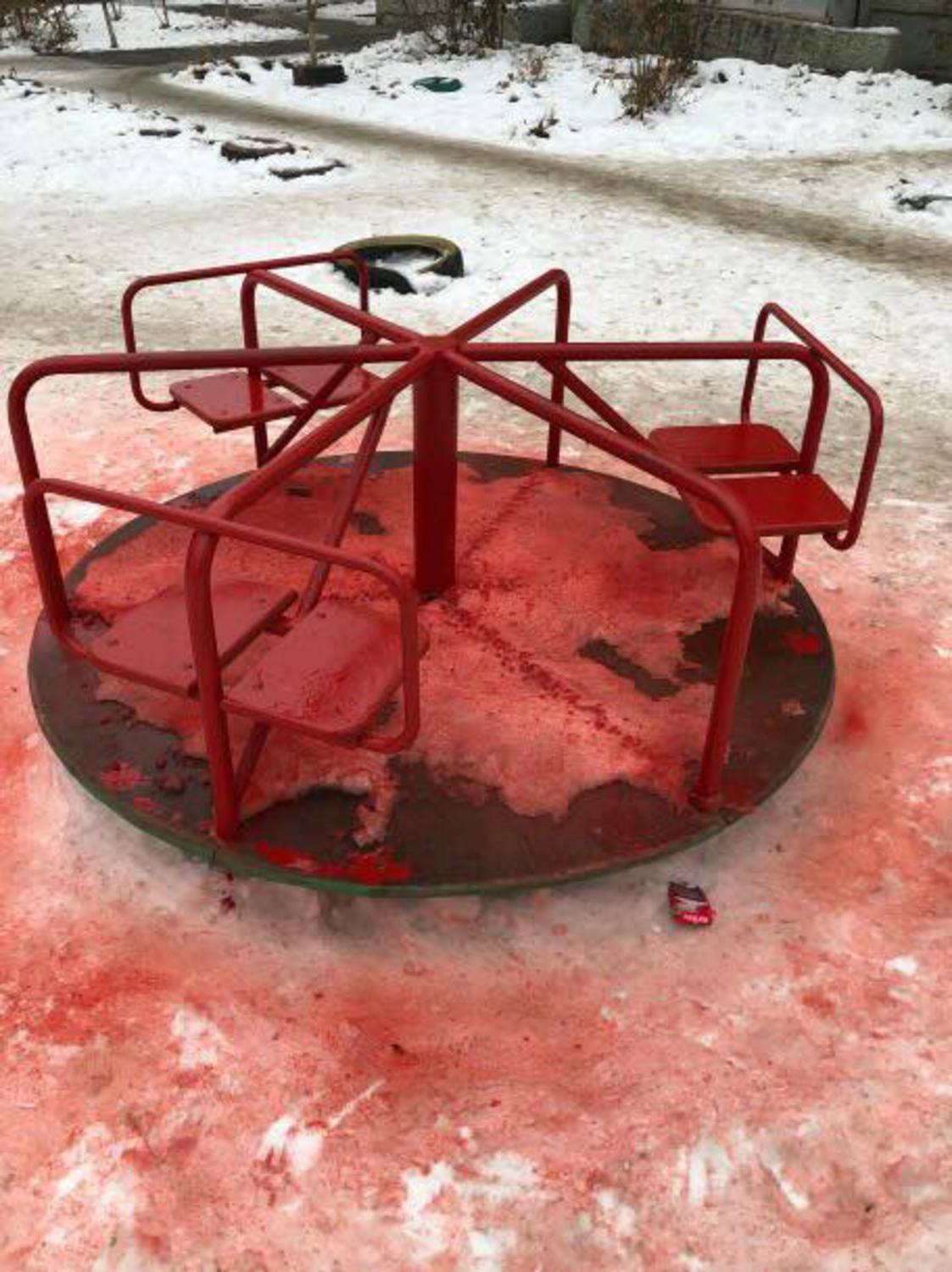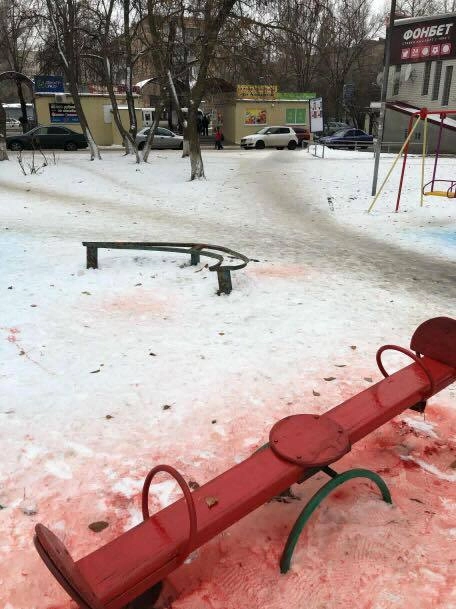 На одной из детских площадок Ростова-на-Дону покрасили горку и качели в красный цвет. Но сделали это так, что снег вокруг окрасился тоже, и площадка стала похожа на декорации к фильму ужасов или место жертвоприношения.