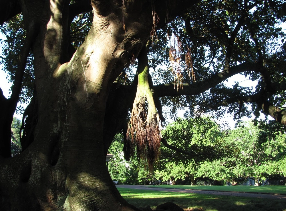 21. Посреди парка стоит огромное дерево с воздушными корнями.