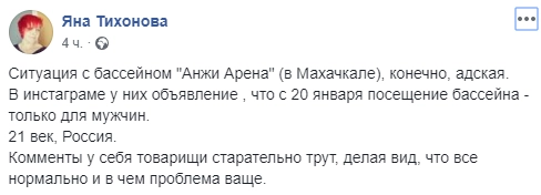 Бассейн спортивного комплекса «Анжи-Арена» в дагестанском Каспийске с этой недели стал закрытым для женщин. Руководство комплекса объявило об этом в Instagram-аккаунте бассейна.