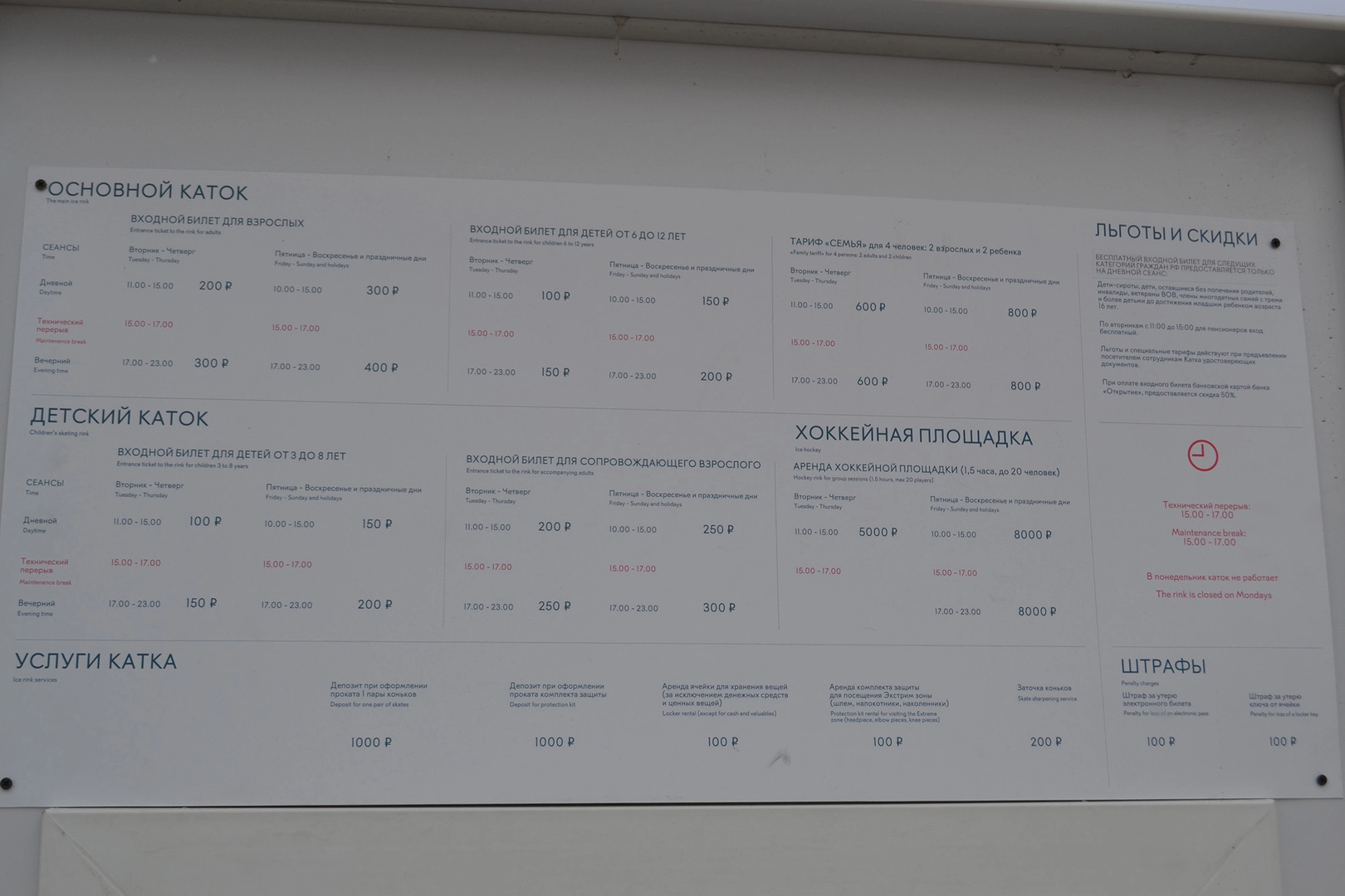 В выходные цены подскакивают на 100 рублей, в понедельник каток закрыт на профилактику.