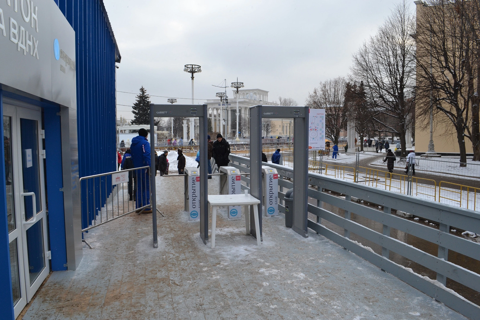Вместо билета вам дадут магнитную пластиковую карточку, по которой вы сможете пройти на территорию через турникеты. Рамка металлодетектора пищит, значит, работает. Больше это ничего не значит, обыскивать никто не собирается. Каток начинается с раздевалки, она спрятана за этой синей стеной. Всего их три — общей площадью 1,1 тысячи квадратных метров.