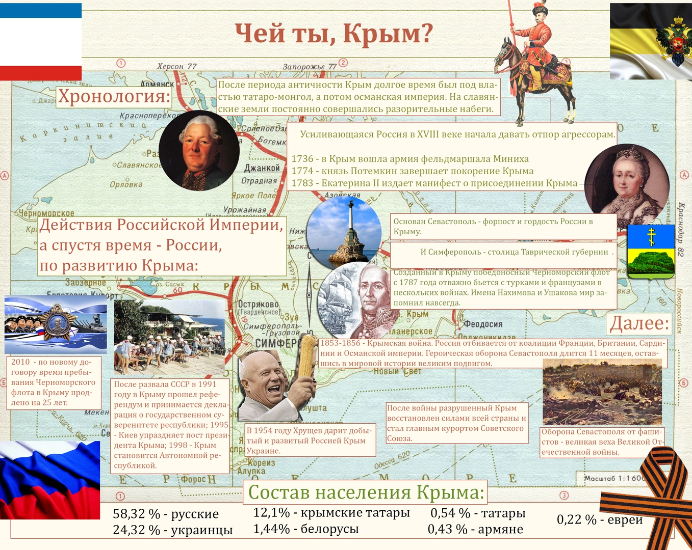 В 1991 году национальная рознь вернулась на нашу территорию. Страна распалась, цвет кожи и гены стали предметом споров и драк между соседями. Тогда же начались и разговоры, что русские к Крыму отношения не имеют: территория – украинская, родина – татарская, история – греческая. Каким образом на украинско-татарской территории оказался город русской воинской славы сторонники независимости и евроинтеграции предпочитают не распространяться. Моё, и всё тут, логика проста. Тем не менее, их точка зрения противоречит даже статистике.