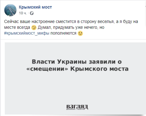 «Сейчас ваше настроение сместится в сторону веселья, а я [мост] буду на месте всегда. Думал, придумать уже нечего, но мифы [о Крымском мосте] пополняются», — говорится в сообщении.
