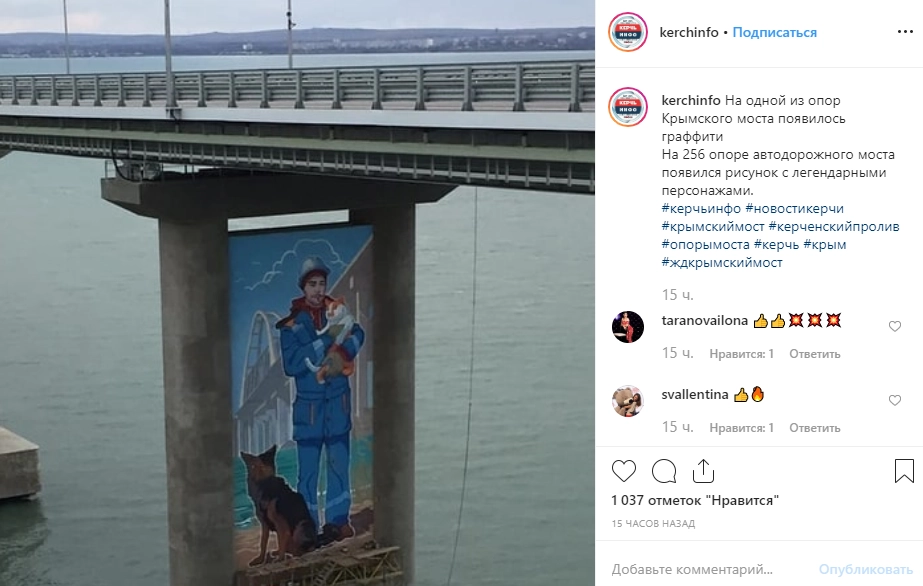 Фотография рисунка с «легендарными персонажами» на 256-й опоре автодорожного моста опубликована на странице «Керчь ИНФО» в Instagram.