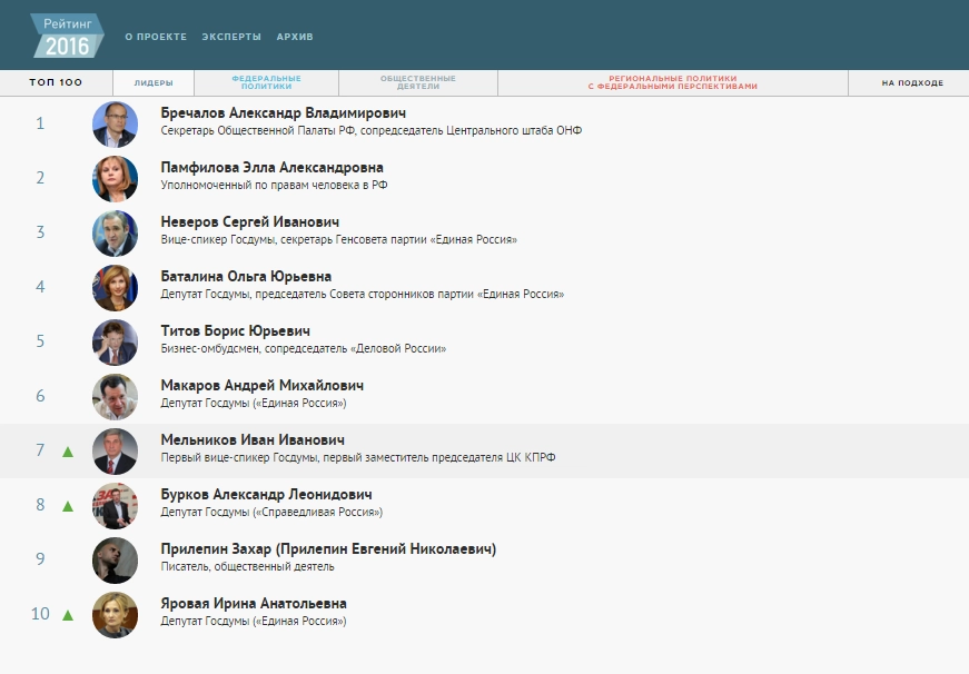 Для каждой из указанных выше категорий эксперты фонда рассчитали отдельный рейтинг. Десять же номинантов с наивысшими экспертными оценками выделили в группу лидеров. В топ-десять вошли шесть «федералов» и четверо общественников.