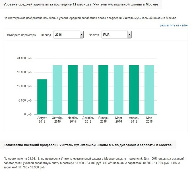 По словам многих работников музыкально-образовательной сферы, проблем с педагогами нет только в десятке лучших музыкальных школ страны, вроде специальной музыкальной школы имени Гнесиных. В учреждениях попроще ситуация куда хуже. Заработная плата преподавателей в музыкальных школах оставляет желать лучшего даже в Москве. На скриншоте ниже — статистика по столице от сайта труд.ком.