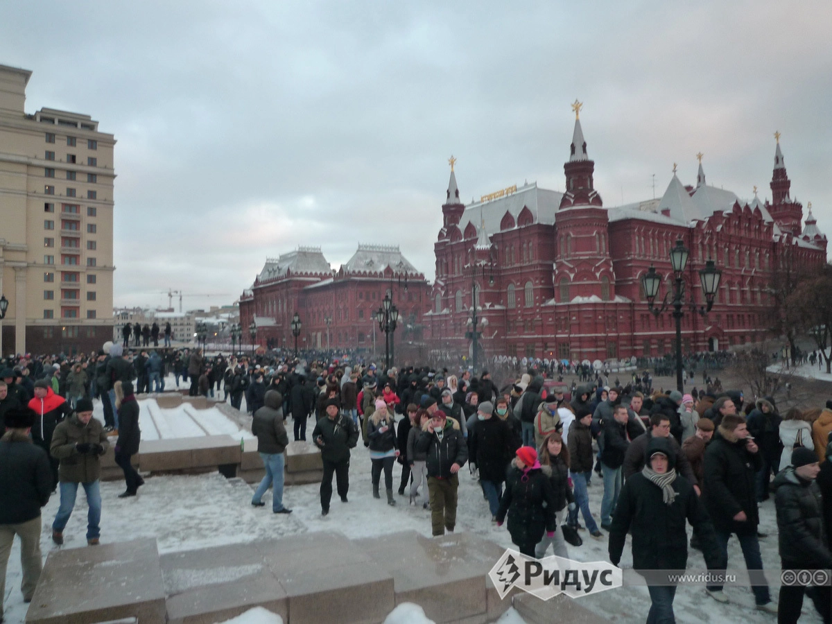 Когда ехал, ожидал, что будут перекрыты выходы из метро или вовсе закрыты, но на станции «Охотный ряд» все было на удивление буднично. Меня поразило отсутствие интереса милиции к собравшимся. Они никому не чинили препятствий. То есть об акции на Манежной площади я знал, потому что читал и друзья звонили и рассказывали. Это не было секретом. По этой логике об акции должны были знать и власти. Когда вышел наверх, удивился многочисленности толпы. Не билось одно с другим.