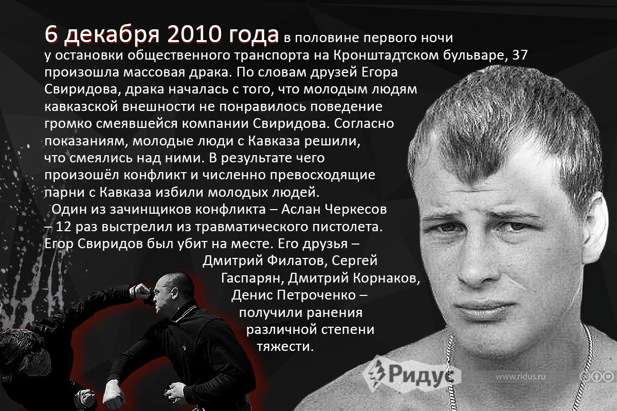 Сегодня исполнилось десять лет, как на Манежной площади прошли массовые беспорядки. Поводом для столкновения с правоохранительными органами стало убийство болельщика столичного «Спартака» Егора Свиридова. С помощью очевидцев ridus.ru воссоздал цепочку событий, произошедших в Москве с 6 по 11 декабря 2010 года.