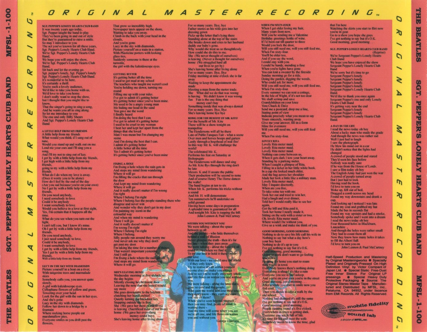 На обратной стороне конверта только Маккартни стоит спиной к зрителю. На его фигуру наложен текст песни Within You Without You (В тебе, но без тебя). Длинное тире проходит по шее музыканта, напомним, согласно легенде, оставшегося без головы.