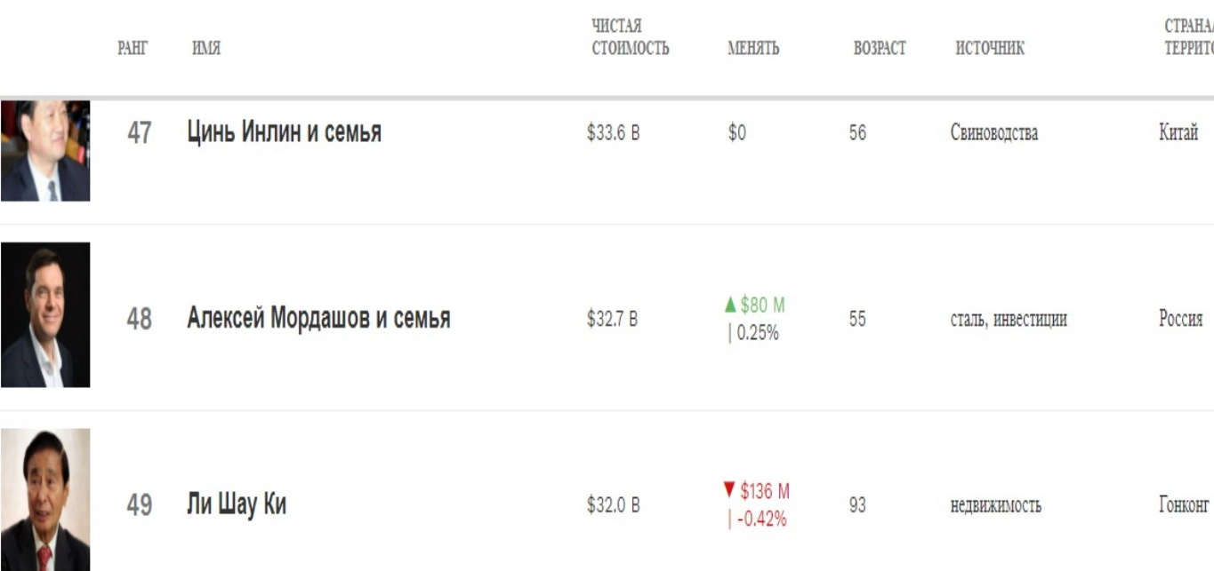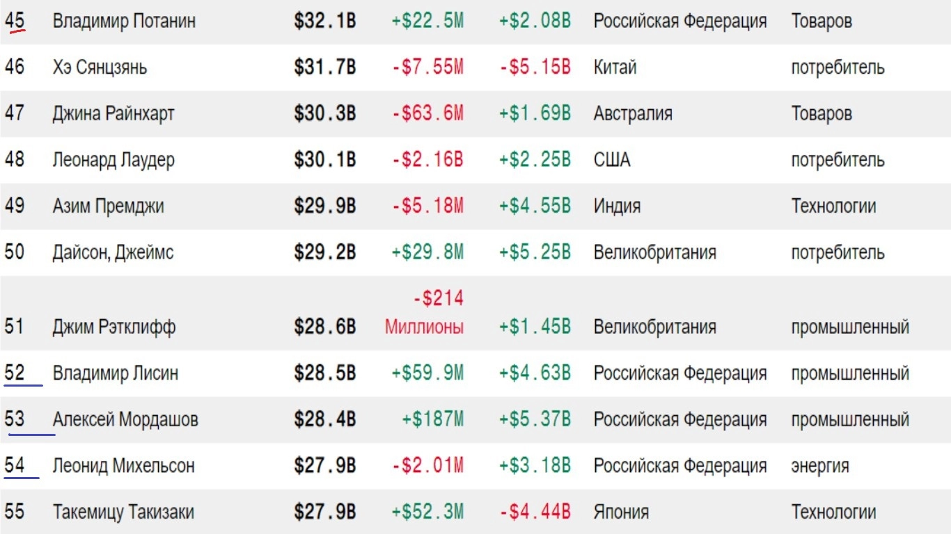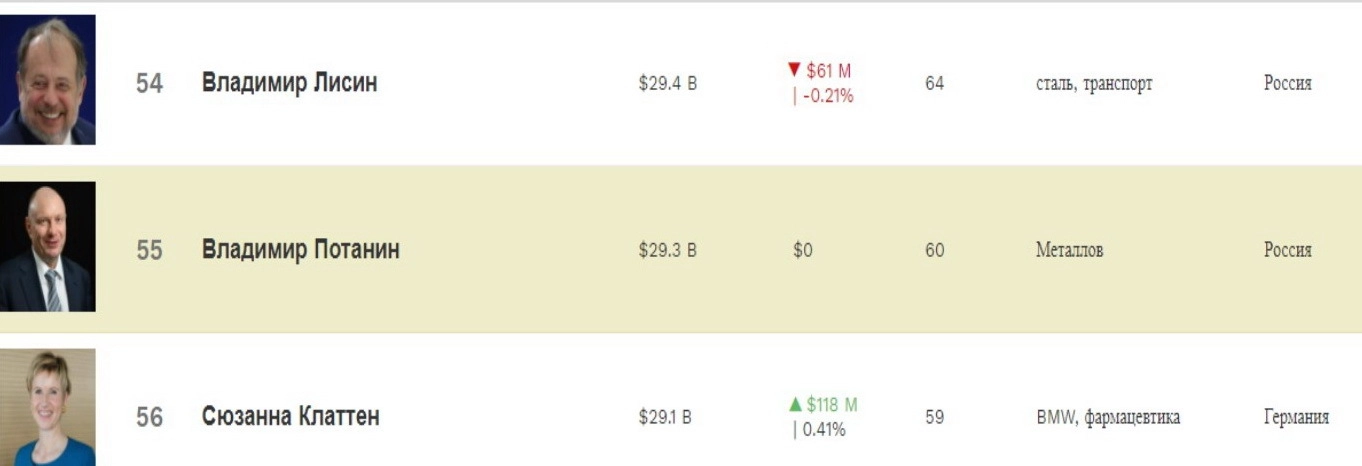 По данным рейтинга Forbes Real-time, Потанин занимает только третью строчку с состоянием в 29,3 млрд долларов. Лисин, как и в рейтинге Bloomberg, остается на второй позиции, но Forbes оценивает его состояние на один миллиард долларов выше — 29,4 млрд.