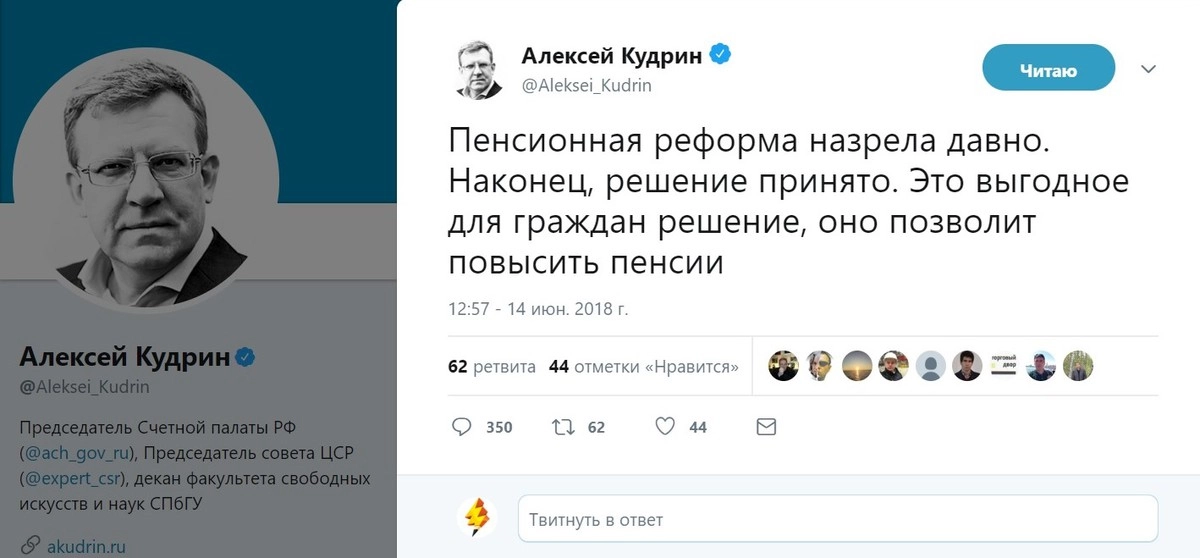 «Пенсионная реформа назрела давно. Наконец решение принято. Это выгодное для граждан решение, оно позволит повысить пенсии», — сообщил Кудрин.