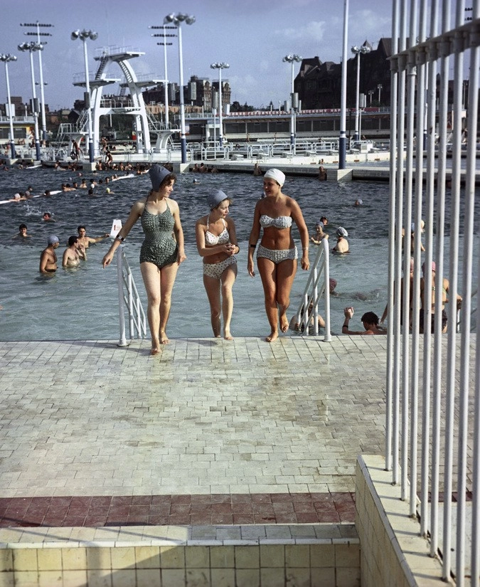 "Ридус" публикует подборку фотографий советских женщин в модных купальниках — остроконечные чашечки верхней части купальника и нижняя часть в форме обтягивающих шортиков, или закрытый купальник с лифом без бретелек.
