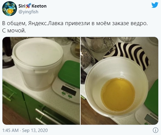 «В общем, Яндекс. Лавка привезли в моем заказе ведро. С мочой», — написала она.