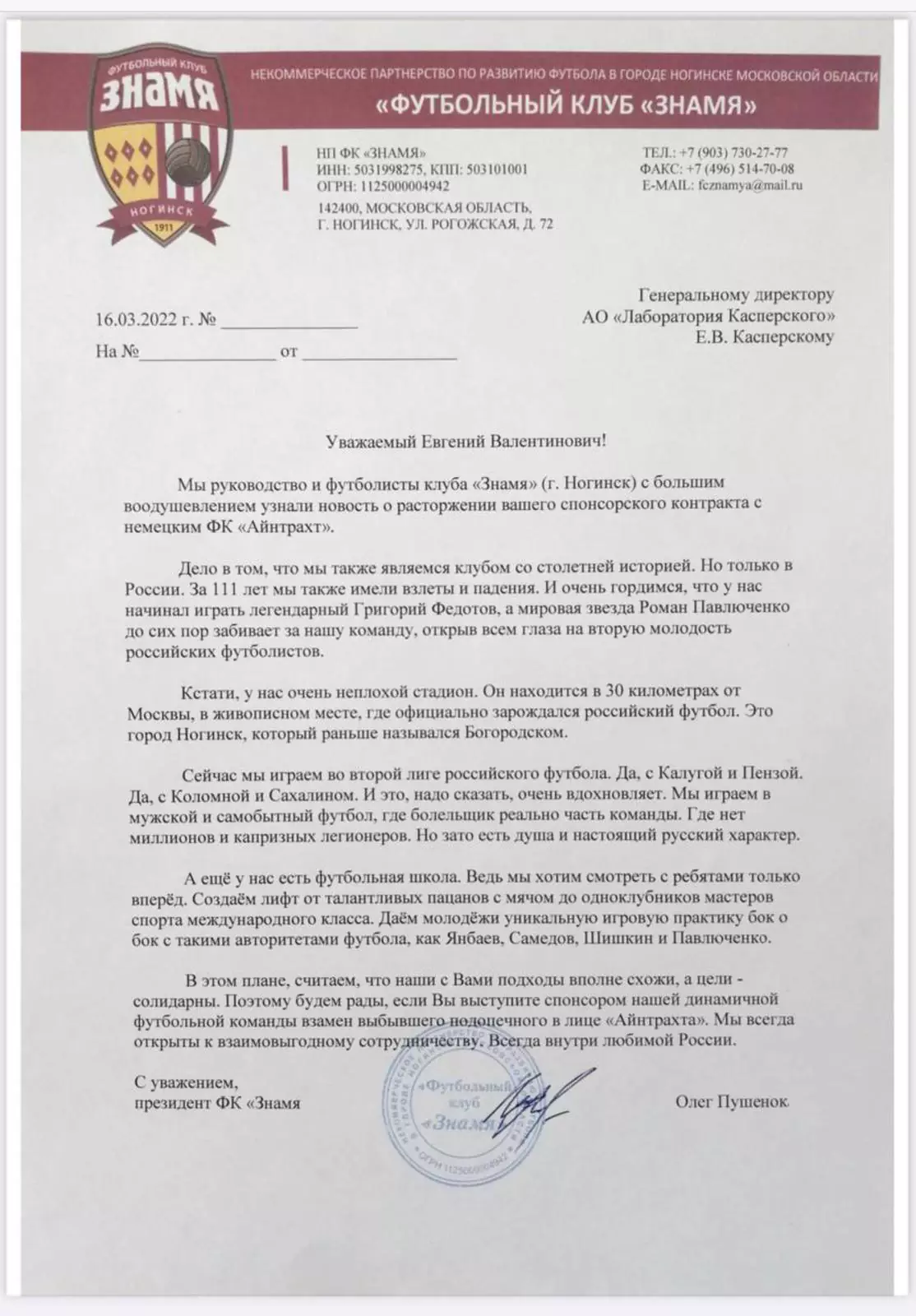 В обращении президента футбольного клуба со столетней историей говорится, что у «Знамени» и «Лаборатории Касперского» схожи подходы и солидарны цели.