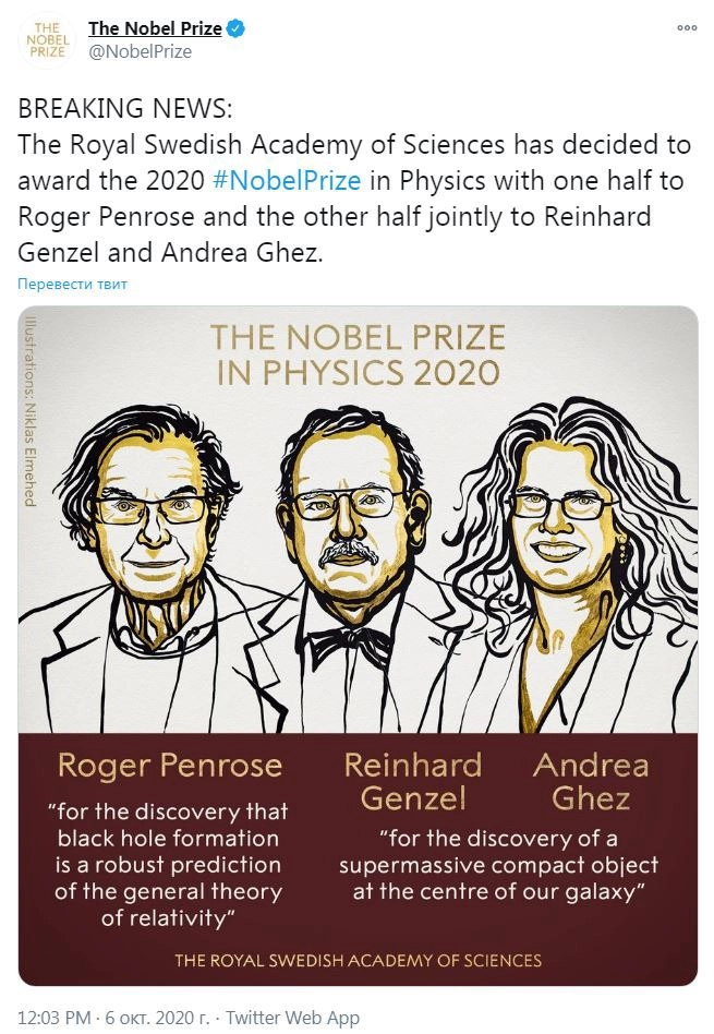 Нобелевский комитет присудил премию по физике за 2020 год британскому математику Роджеру Пенроузу (Оксфорд), немецкому астрофизику Райнхарду Генцелю (Институт Макса Планка) и их американской коллеге Андреа Гез (Калифорнийский университет) за исследования черных дыр.