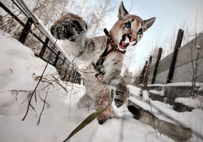 Полугодовалая пума по кличке Льдинка играет в красноярском зоопарке "Роев Ручей". © Илья Наймушин/Reuters