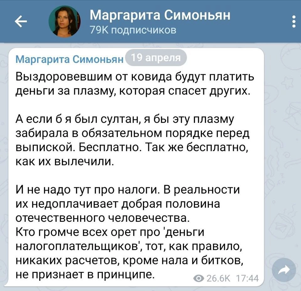 Медиаменеджер в этом посте раскритиковала идею платить россиянам, переболевшим коронавирусной инфекцией, за добровольную сдачу плазмы, которая содержит антитела и может сделать лечение заразившихся людей гораздо эффективнее. Симоньян полагает, что ее можно забирать и бесплатно в обязательном порядке — на том основании, что около половины граждан все равно недоплачивают налоги.
