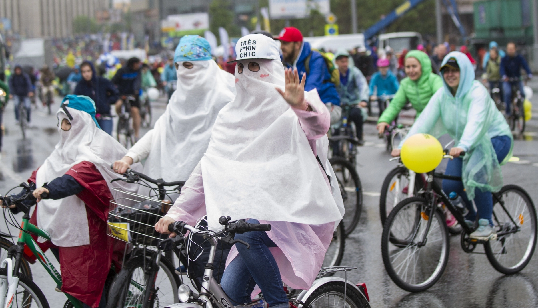 Лица 30 тысяч велосипедистов под проливным дождем в центре столицы