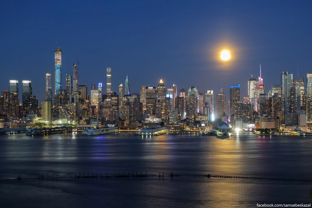 Для начала традиционная красота. Полная луна встает над мидтауном Манхэттена.