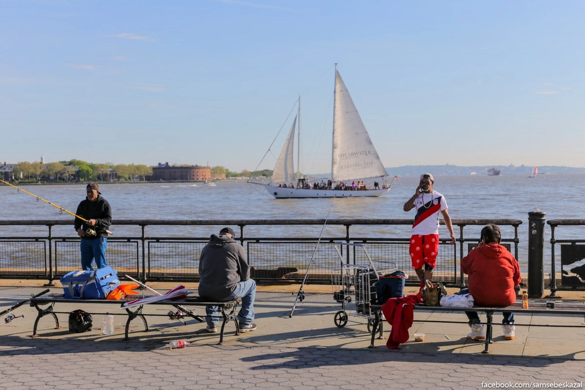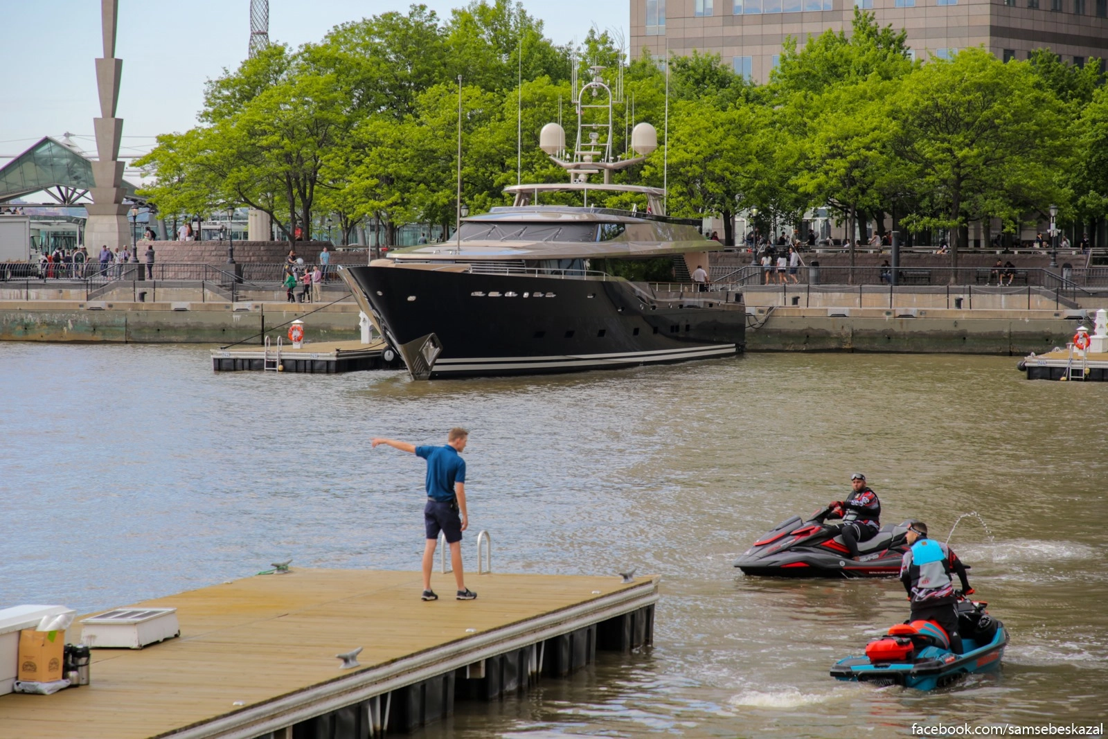 Марина у зданий Всемирного финансового центра. На яхте есть специальная занавеска, чтобы люди гуляющие по набережной не пялились на обедающих на корме. Все у людей продумано :)