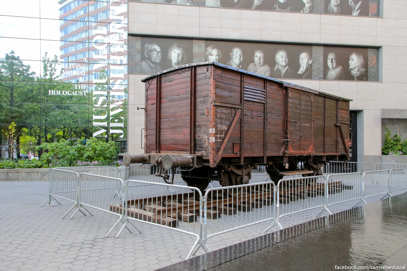 У здания еврейского музея в даунтауне Манхэттена установили немецкий вагон времен Второй мировой войны, аналогичный тем, в которых вывозили евреев в концентрационные лагеря. В самом музее идет выставка посвященная лагерю смерти Освенцим.