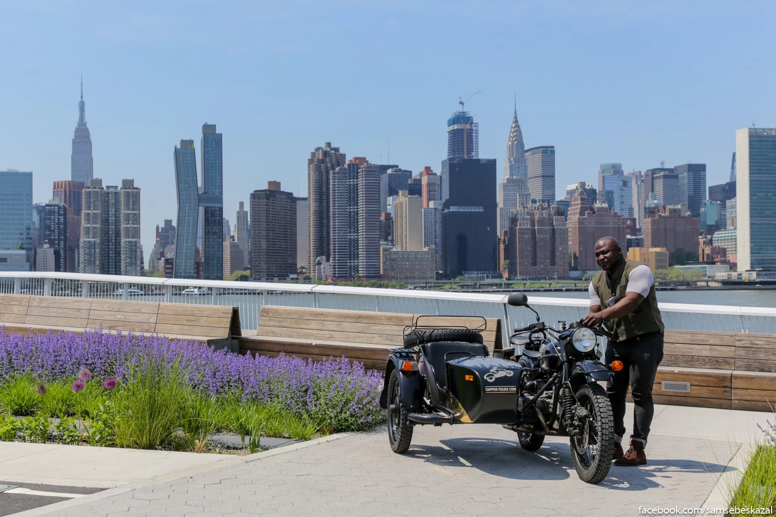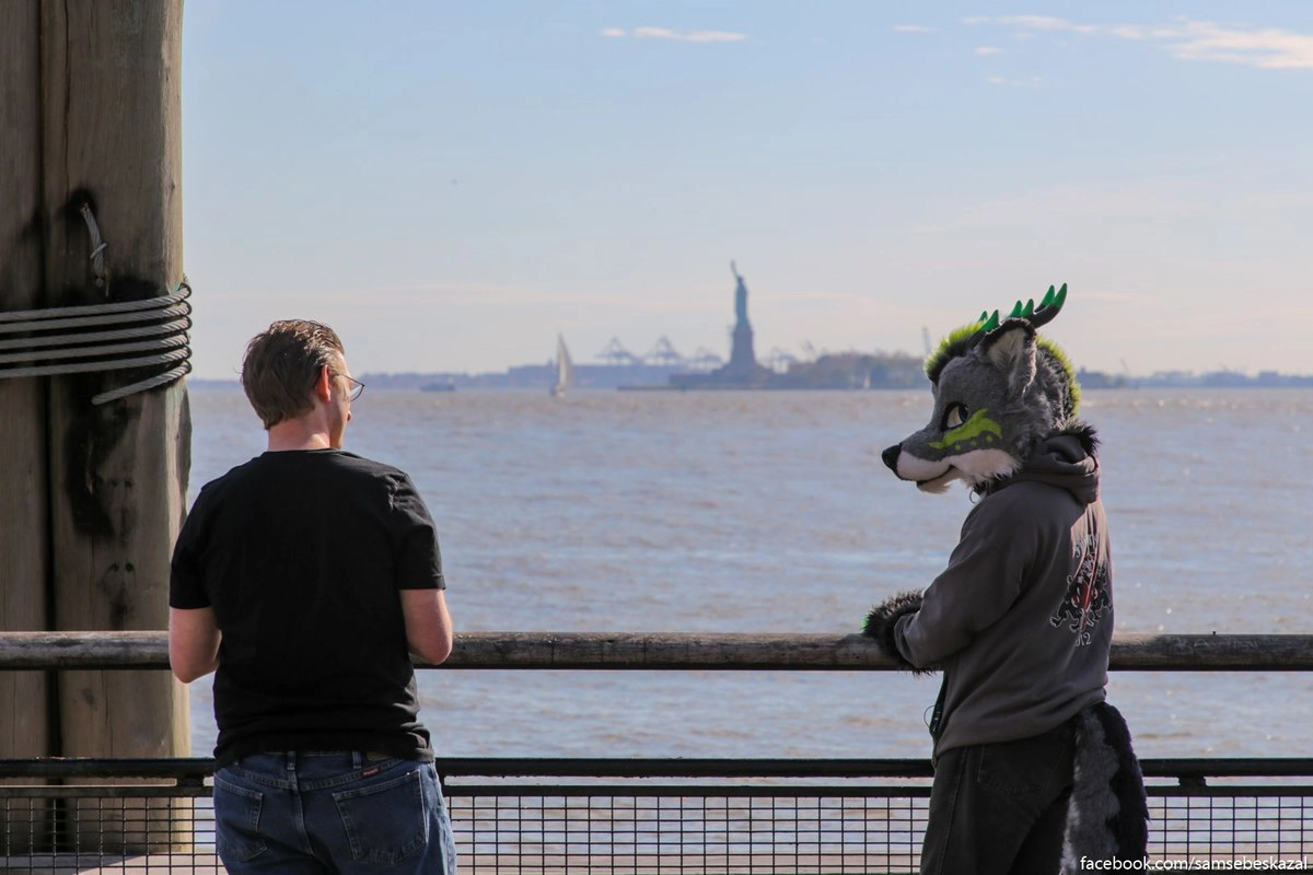 На такое в Нью-Йорке быстро перестаешь обращать внимание. Чувак одетый как волк приехал на фотосет с видом на Статую Свободы.
