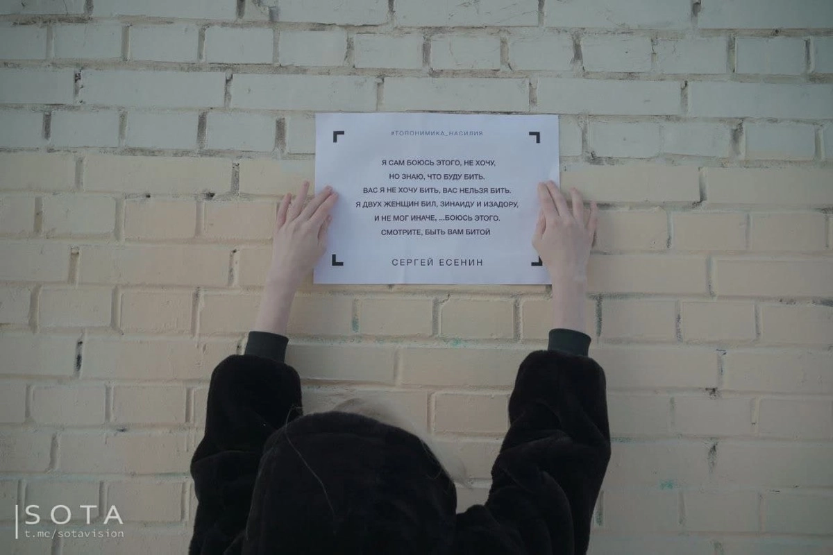 Активистки расклеили на стенах домов под табличками с адресами «улица Толстого», «улица Достоевского», «улица Некрасова