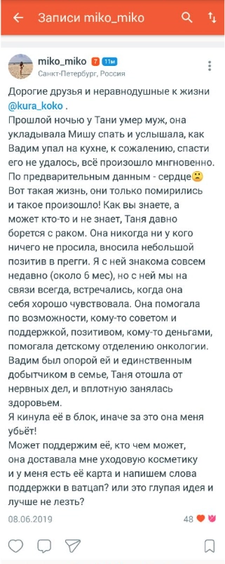 А потом в дом Танечки пришла беда: якобы у нее скоропостижно скончался муж, с которым она едва успела помириться. Правда, узнали об этой Танечкиной беде участницы мамского сообщества не от самой Танечки, а от ее знакомой, некой Ани, у которой совершенно случайно оказался номер Танечкиной карты вместе с убедительной историей, почему вдруг она его знает.
