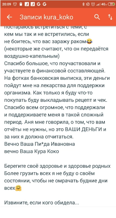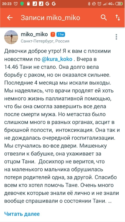 Но встреча не состоялась, якобы у Танечки была свекровь, да и сама она плохо себя чувствовала. Одновременно Таня написала в приложении пост, в котором благодарила девочек за переводы и обещала отчитаться за каждую копейку.