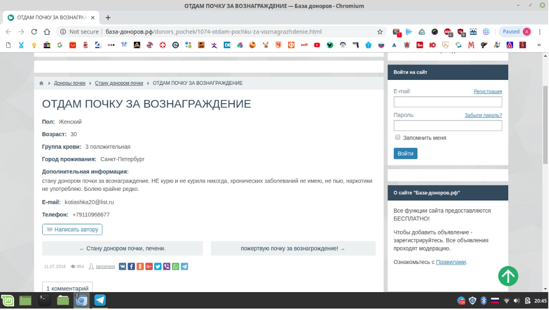Участницы проверили в поисковых системах номер +79110968677 и нашли объявление о продаже почки. Согласитесь, странная идея для женщины, умирающей от рака.