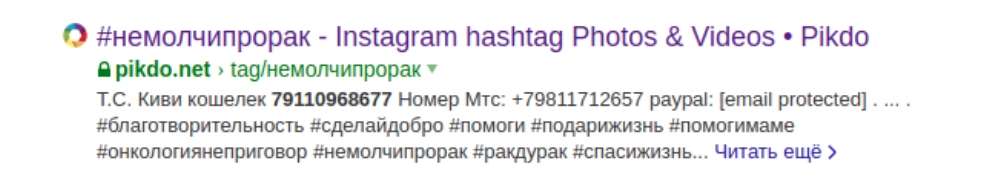 В сниппете выдачи по номеру +79110968677 обнаружился еще один номер телефона: +798111712657. И поисковая система тут же порадовала детективов сбором на умирающего от рака головного мозга мальчика Никиту Плотникова, сына очередной Татьяны Сергеевны П.