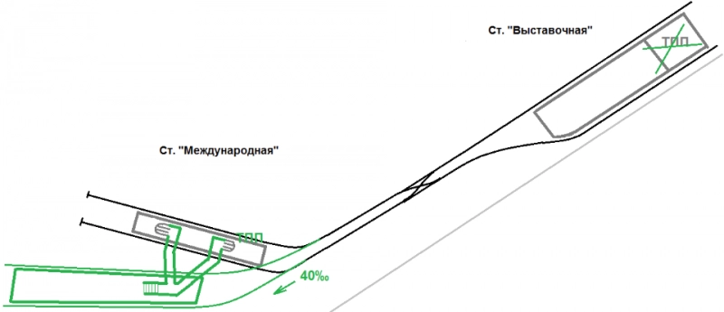 Пару лет назад участник форума «Наш транспорт», ссылаясь на одного из проектировщиков, выложил представленную выше схему решения проблемы с короткими платформами на этих станциях. Рядом с «Международной» мы строим ещё одну станцию, которая её заменит, а в объём действующей будет перенесена тягово-понизительная подстанция с «Выставочной», занимающая там место. Но лично я не верю, что на такие дела кто-то выделит деньги. Вот на новую линию — да, пожалуйста. А тут целую станцию закрыть надо, это же серьёзный удар для имиджа властей. Поэтому я вижу вместо этого продление от существующих путей «Международной» на запад.
