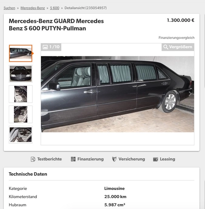 На немецком сайте Mobile.de — крупнейшей онлайн-площадке по продаже подержанных машин — появилось объявление о продаже автомобиля, якобы использовавшегося президентом России Владимиром Путиным в качестве служебной машины.