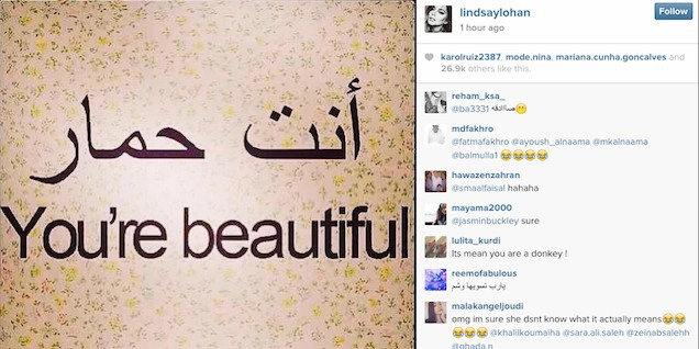 Линдси Лохан регулярно попадает в какие-нибудь неловкие или курьезные ситуации. На этот раз 28-летняя актриса поделилась со своими поклонниками в Instagram картинкой с надписью на арабском языке, которую создатели изображения перевели как «Ты красивая» (You're beautiful). Этим сообщением она хотела сделать комплимент своим поклонникам.