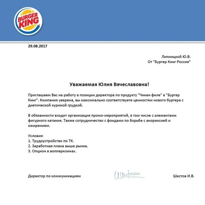 Липницкой также предложены трудоустройство по ТК и зарплата выше рынка, приводит Eurosport содержание письма.