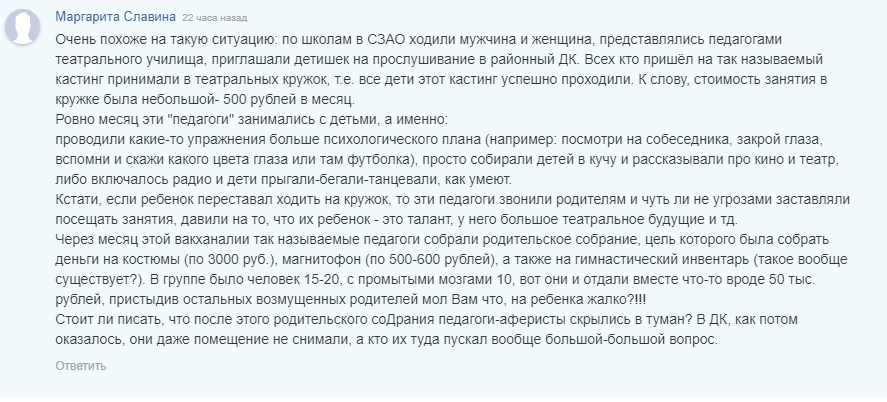 К обсуждению этой ситуации подключились жители и других российских городов. Маргарита Славина из Москвы рассказала, как аферисты изображают из себя педагогов по танцам или актерскому мастерству и внушают родителям, что у их детей большое театральное будущее.
