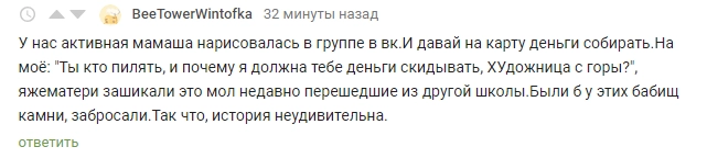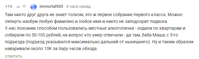Дело Остапа Бендера живет! Как вам такое: приходит дама на первое родительское собрание детского творческого коллектива, „соглашается“ стать главой родительского комитета, тут же собирает по 500 р. на праздники, настаивает дальше сдать по 3000 на костюмы, по 600 на фестиваль и т. д., — сообщила женщина.