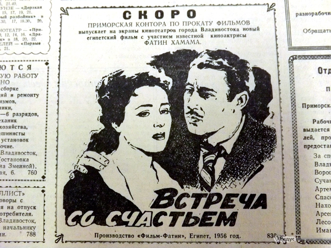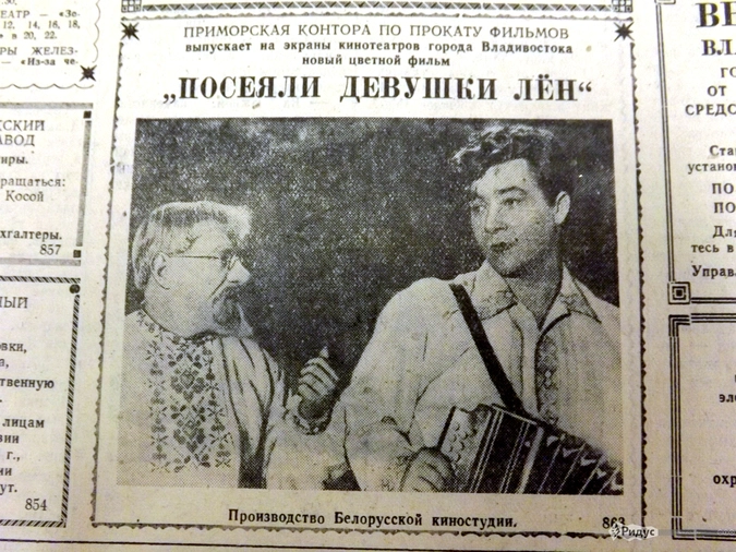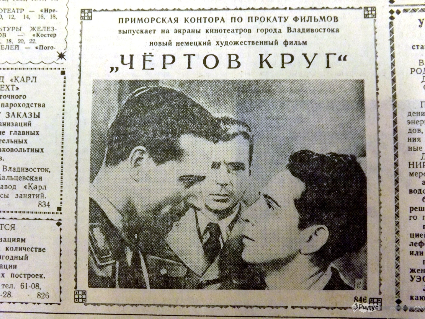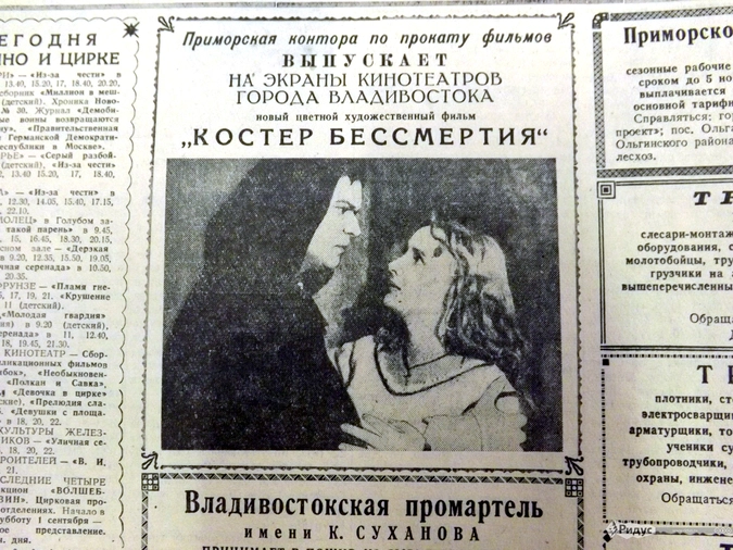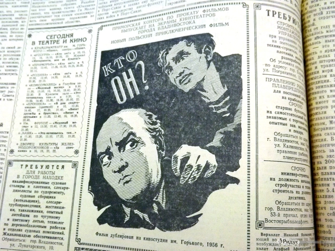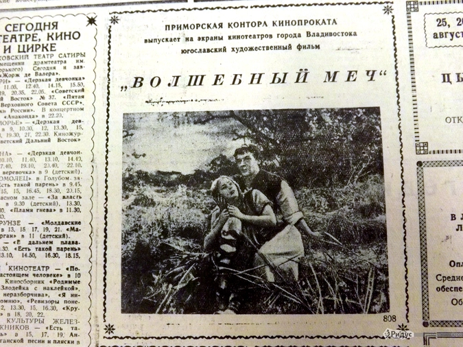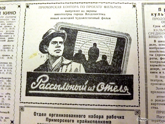 Но самый шик — реклама, особенно киношная. Мы про это забыли (а то даже и знать не знали), но ведь какой широчайший кинорепертуар был в Советском Союзе! Да, не показывали большинства американских новинок, но зато у зрителя было полное представление о том, чем живёт соседняя Европа! Вы только посмотрите: фильмы из Греции, Югославии, Германии, Польши, Венгрии, Финляндии!.. А как представлены союзные республики!.. И ведь это не столица, где «всё есть», а Владивосток, на другом конце света.