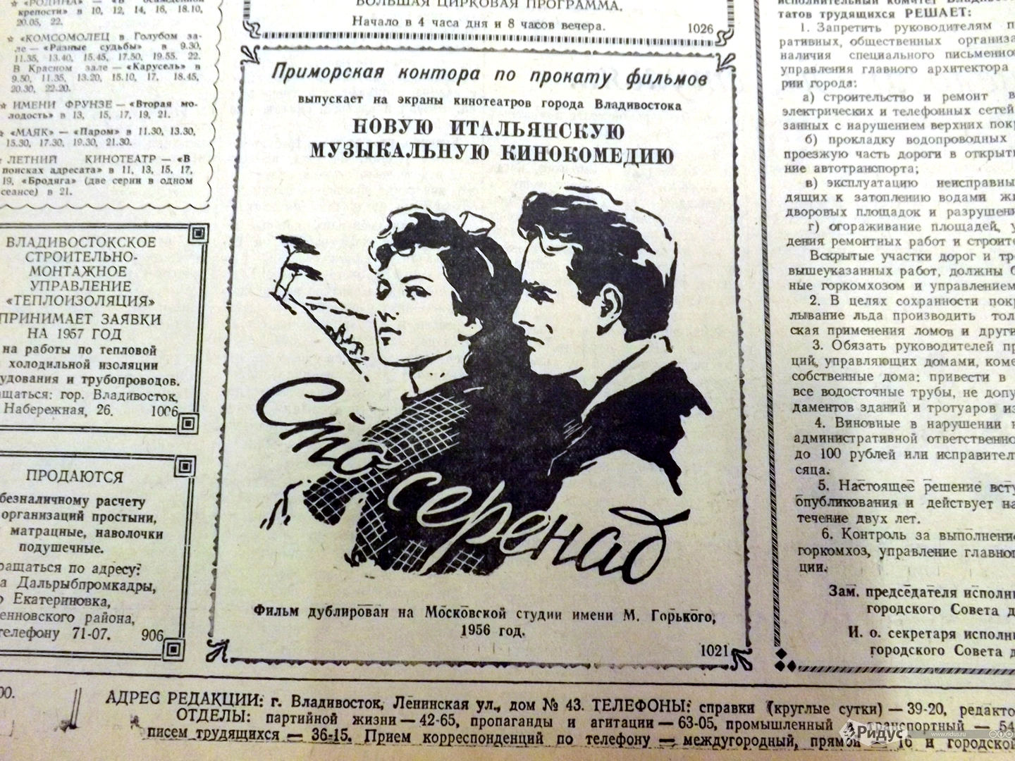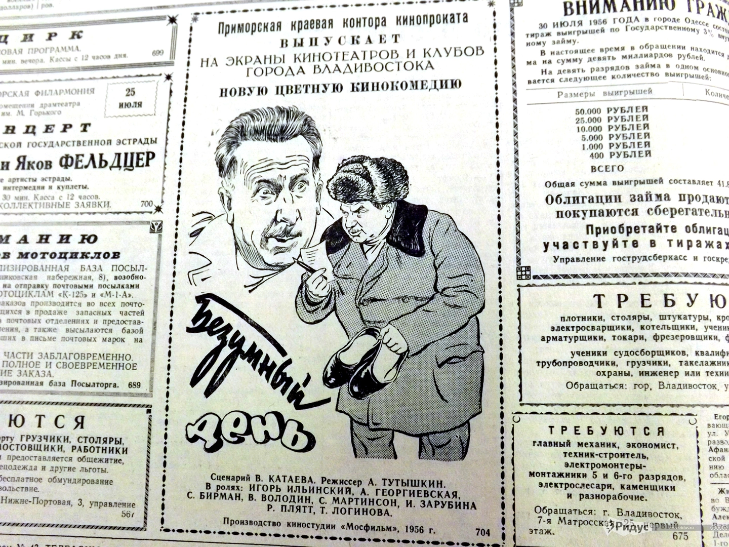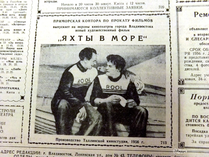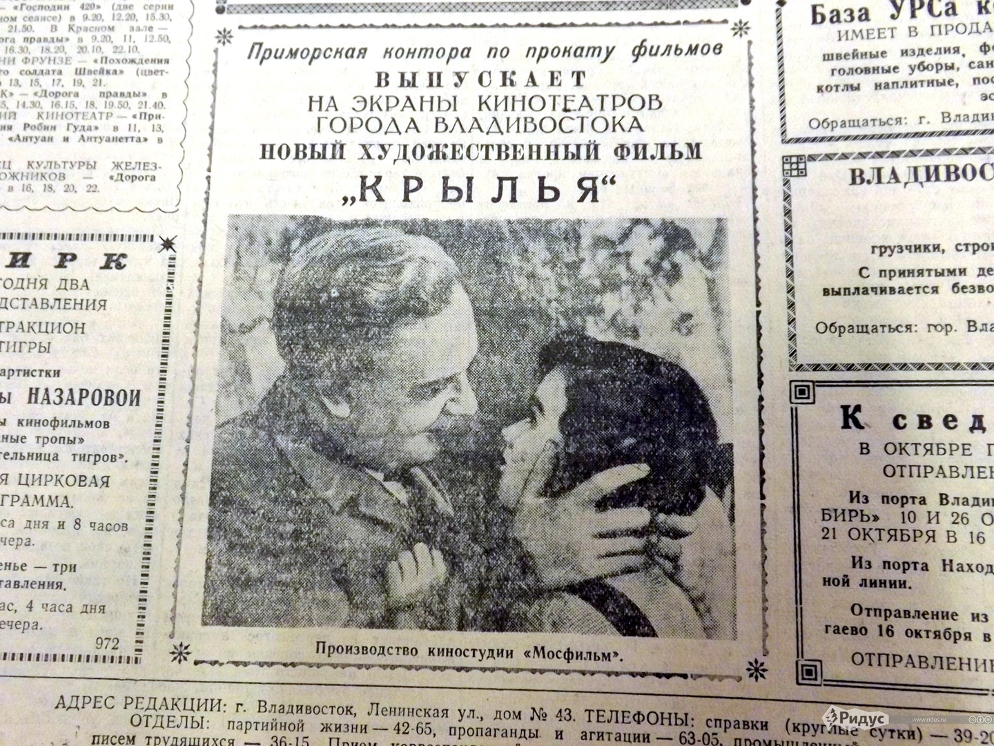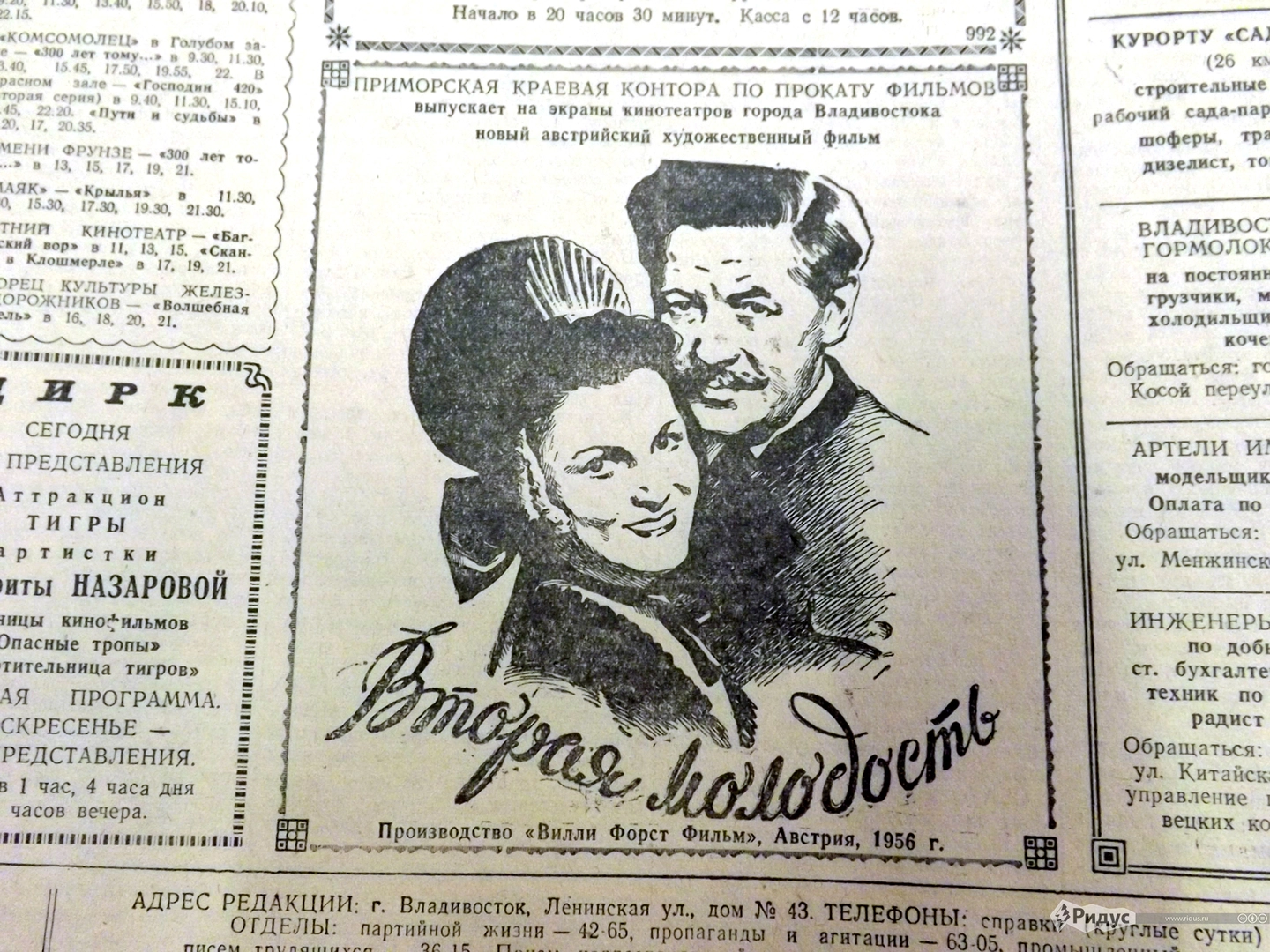 Сейчас такого изобилия у нас попросту нет. Единственная замена подобному, ушедшему в прошлое прокату, как верно отметил Александр Роднянский, — кинофестивали. Во Владивостоке это — «Меридианы Тихого», собравшие в свою программу лучшее со всего света. А в 1956-м, как свидетельствует «Красное знамя», не надо было ничего и собирать: кино просто было, иди и смотри.