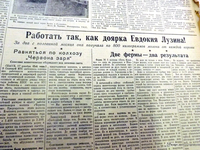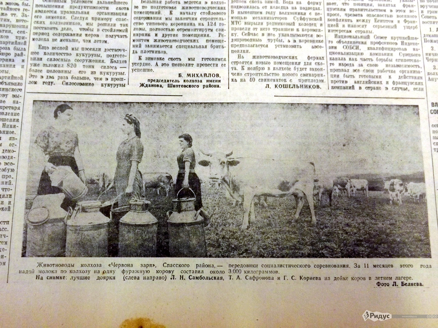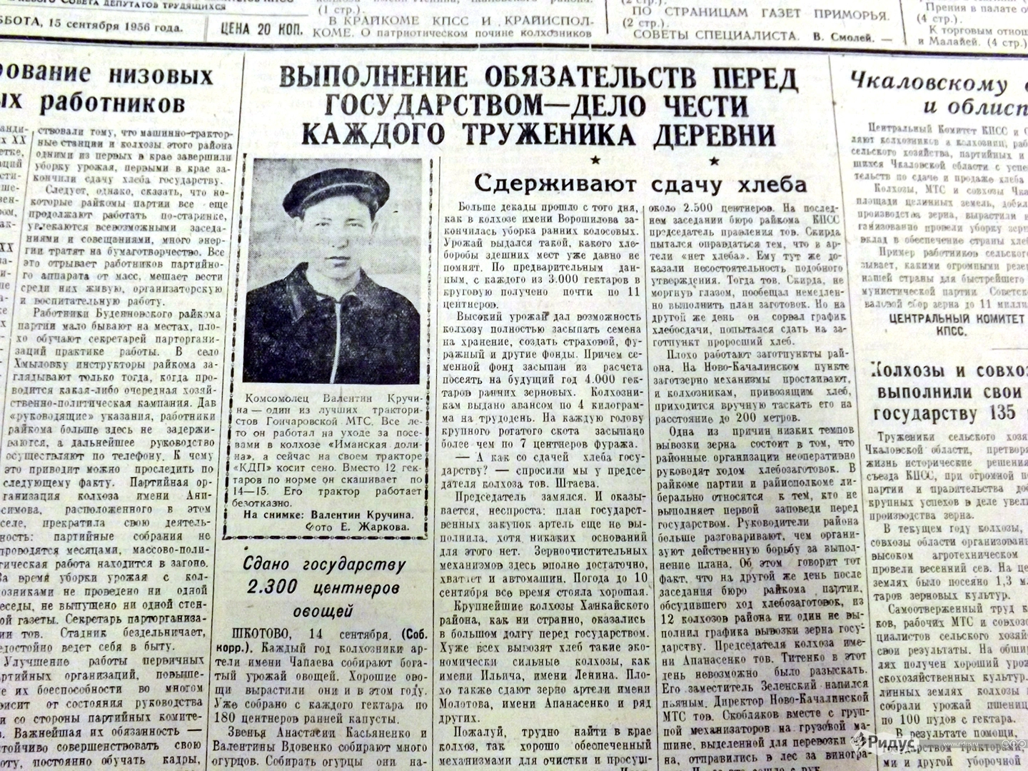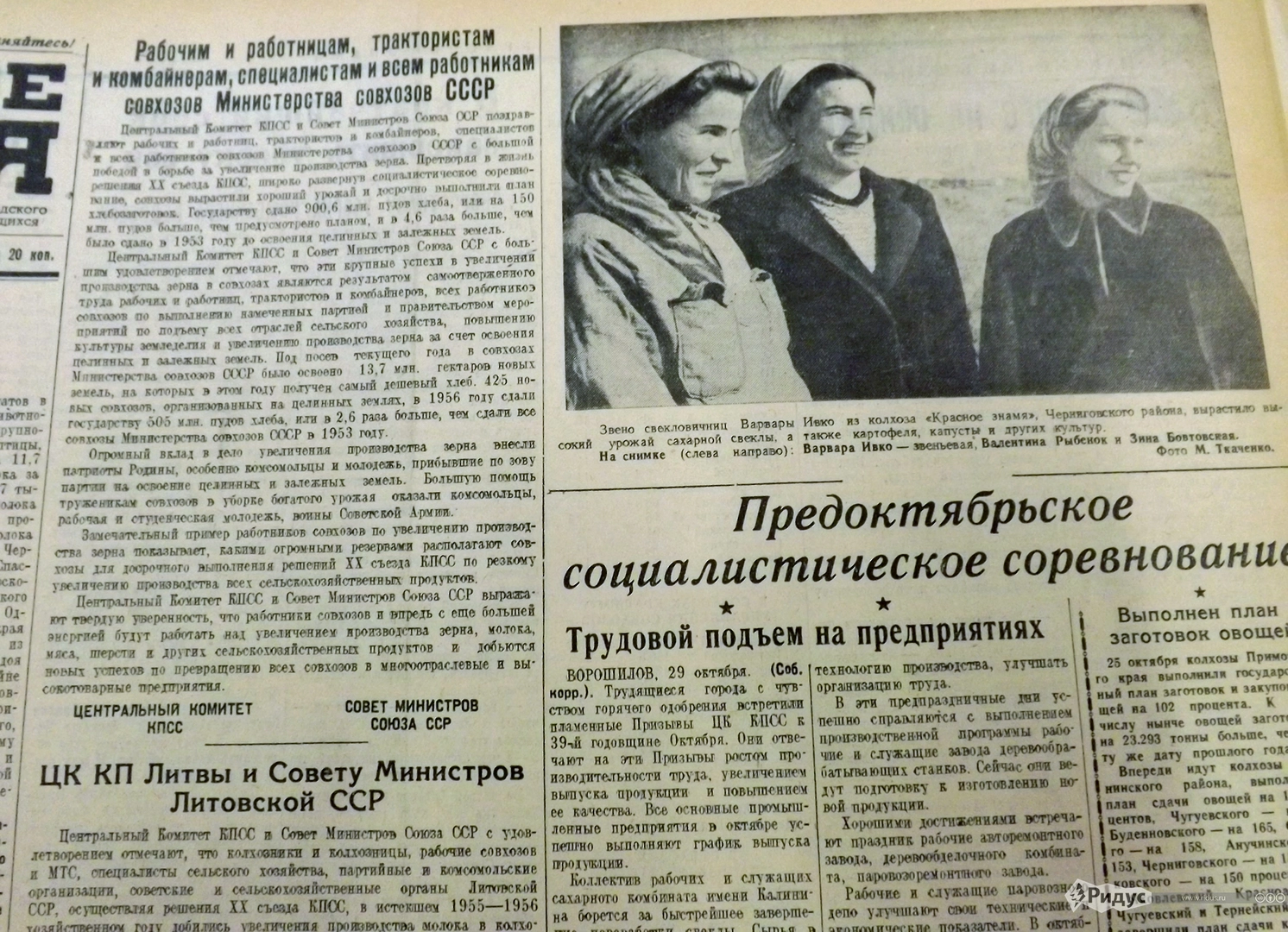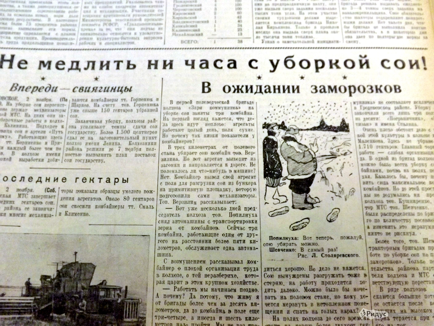 Колхозники, доярки, строители, китобои — вот подлинные «творцы шестой пятилетки», вот кто «звёзды», вот кто главные «ньюсмейкеры» тех дней, от кого зависел успех предоктябрьского социалистического соревнования. «Никакого промедления в уборке картофеля!», «Работать так, как доярка Евдокия Лузина!», «Не медлить ни часа с уборкой сои!» — кричат заголовки. «Берегите сено от степных пожаров!» — предупреждает последняя полоса.