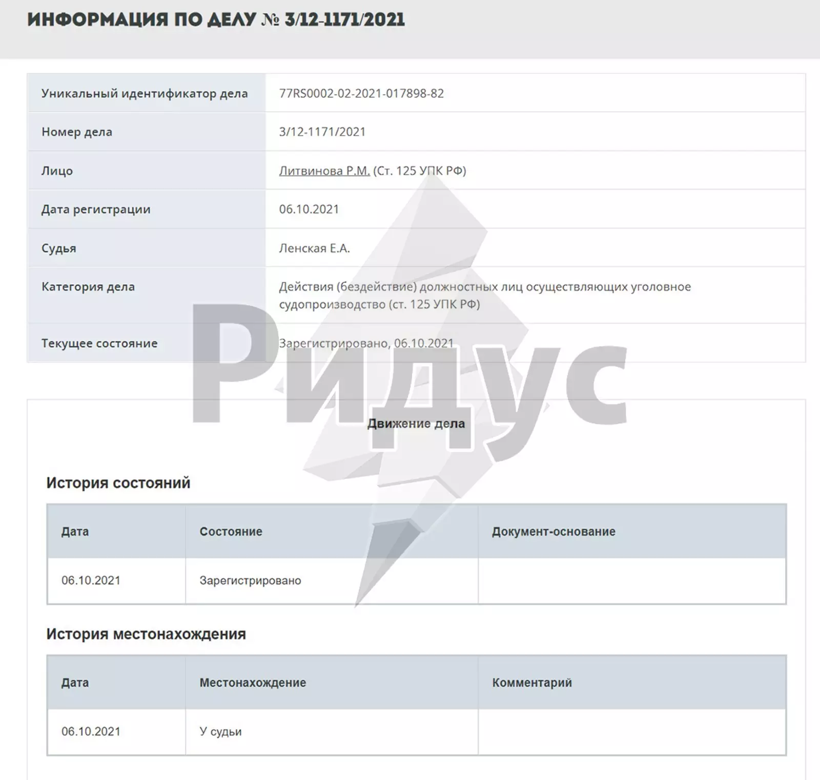 Соответствующую карточку о том, что 6 октября Рената Литвинова обратилась в Басманный суд, редакция «Ридуса» нашла на сайте суда.