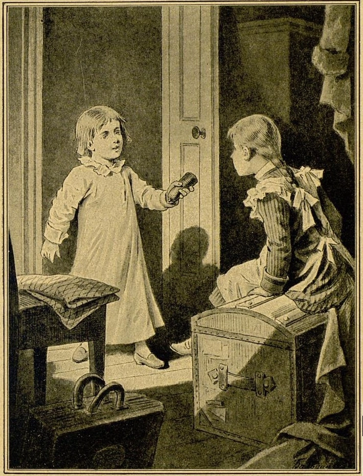 Лунный свет льется в кладовую через маленькое окошко, и в этом свете я вижу маленькую фигурку, которая тихо прокрадывается ко мне. На ней длинная белая сорочка, в каких рисуют ангелов, и лицо у фигурки настоящее лицо ангелочка — беленькое, как сахар. Но то, что фигурка принесла с собою и протягивала мне своей крошечной лапкой, никогда не принесет ни один ангел. Это «что-то» — не что иное, как огромный кусок толстой ливерной колбасы.