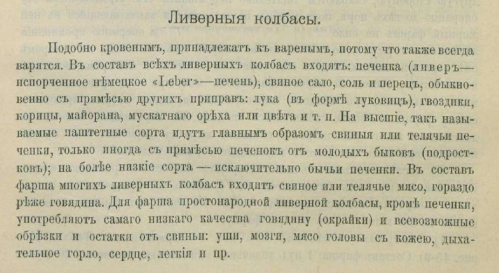 Для начала откроем учебник классика нашей гастрономии и мясного дела Михаила Игнатьева «Колбасное производство» (написанный им совместно с Л. Н. Симоновым в 1901 году). Авторы совершенно четко делят ливерную на высшие паштетные сорта и сорта для простонародья. Время тогда было не слишком политкорректное, так что откровенных определений не стеснялись.
