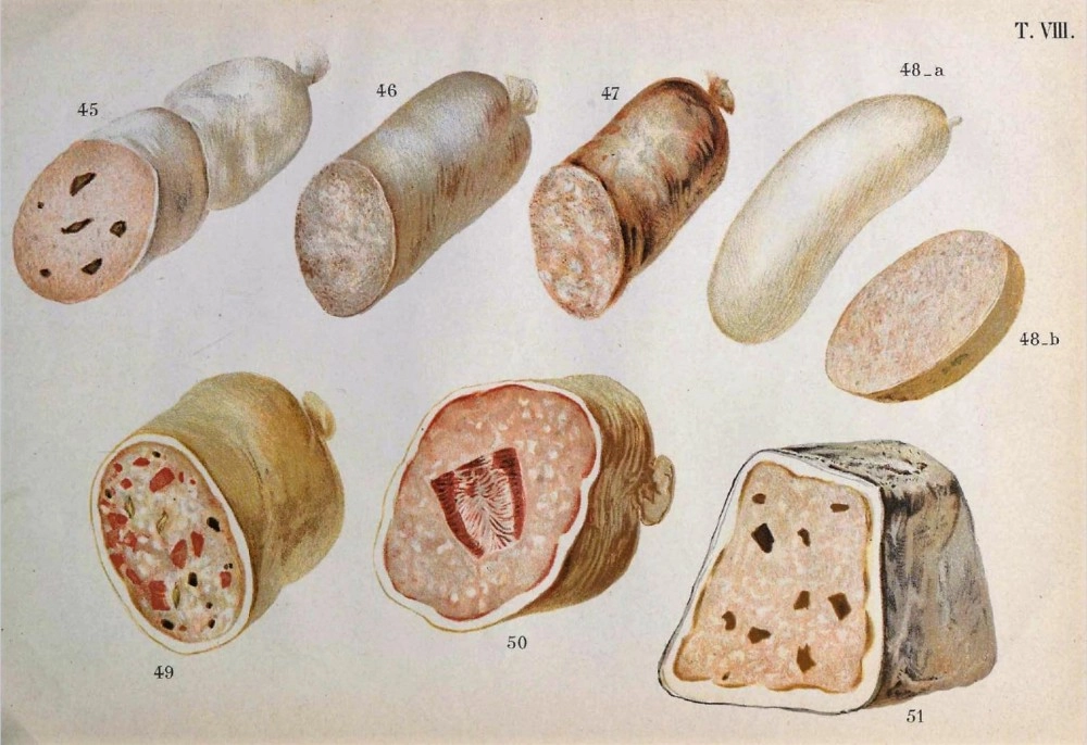 1. Ливерная паштетная колбаса с трюфелями (рис. 45). Состав фарша: 1 пуд. телячьих или свиных печенок, 20 фунтов молодой телятины, 1,5 пуда мягкого свиного жира от молодых свиней, 8 фунтов обыкновенного свиного сала (шпека), 3 фунта черных (варшавских) трюфелей, 20−30 яиц, 7−10 луковиц, 2,5 фунта соли, ¼ фунта толченого белого перца, 1/8 фунта мускатного ореха, 1/8 фунта гвоздики и 1/8 фунта корицы. Печенки, телятина рубятся возможно мелко, трюфели нарезаются кусочками (видны на рисунке), накрошенные луковицы выжариваются в свином сале и в фарш из них поступает только растворившийся в сале сок (вместе с салом), твердые же частицы отбрасываются. Хорошо проделанный фарш набивается в тонкие бычьи или бараньи кишки. Набитая колбаса варится до готовности 1,5 часа.